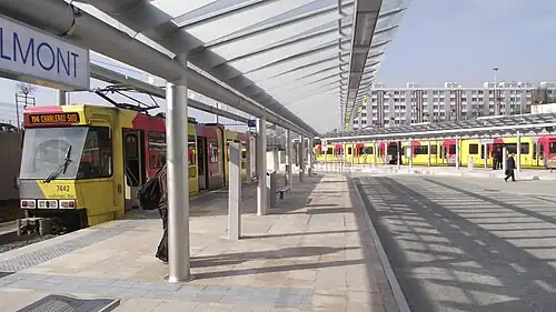 Soleilmont (French pronunciation: [sɔlɛjmɔ̃]) is a Charleroi Metro station located in Gilly, Belgium (part of the Charleroi municipality), opened on 27 February 2012 as part of the Soleilmont extension of the Gilly branch of the Charleroi Metro. The station, built at ground level, is the terminus of the Gilly branch (line M4) and is an intermodal transport hub served by trams and buses and featuring a 200 spaces car park.[1]