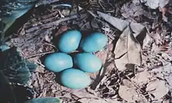 Like other tinamous, it lays oddly-shaped eggs with a glossy, colorful shell,[6] and it eats fruits, and seeds off the ground or low plants. Males will incubate the eggs which are in a nest on the ground, and will also rear the young for the short period of time before they are independent.[4]
