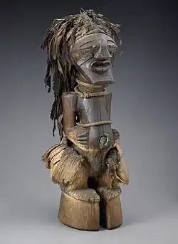 Mankishi (singular: Nkishi) are spirits of the dead that can influence the world of men. These spirits can be malevolent spirits causing infertility, bad harvests and sickness or benevolent spirits bringing good health and prosperity in the hunt and field. The Songye believe that spirits can be reborn; benevolent spirits are believed to be reborn by creating a mamkishi power figure, while malevolent spirits (bikudi) are not reborn and are forced to roam the earth for eternity.[3] Not all spirits who are unable to be reborn as a Nkishi are wandering spirits, spirits who are not reborn yet are knowledgeable on their power and knowledge of patrilineage founders, heroic leaders, and lineage chiefs and dignitaries become guardians of the lineage and provide general protection.[4] Mankishi conform to a certain magico-social standard within the Songye community. Songye figures serves as a protectors of the community, encourages fertility and protects families from evil spirits and practitioners. Nganga (magical practitioners) are responsible for commissioning these figures, they decide the dimensions, sex morphological aspects, and the type of wood used for the figure.