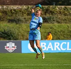 In July 2022 she moved in a free transfer[7] to Lewes FC[5] in the same year that their American raised goalkeeper Tatiana Saunders moved on to play for Durham.[8] Lewes are an unusual team because they offer equal pay to their male and female teams. Their top paid player is a woman.[4] The team did well in the FA cup in the 2022–2023 season making the quarter-finals where they were knocked out, three goals to one, by Manchester United W.F.C.[9]