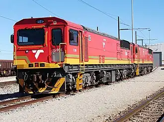 The 50 kV AC 50 Hz Class 15E is the product of a joint venture by Mitsui who was responsible for the design, Toshiba who supplied the electrical components, the RSD division of DCD-Dorbyl who supplied the monoblock cast frame, bolster bogies and drawgear, and Union Carriage & Wagon (UCW) in Nigel who constructed the bodies. It was manufactured for Transnet Freight Rail (TFR) by UCW who delivered the first locomotives in 2010.[2][3][4]