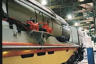 The Class GL made use of Beyer, Peacock's standard lever-actuated Sterling-type steam-operated power reverser and a Pyle National Company turbo-generator. The piston valves were modern straight-ported types with long-lap, long-travel valves, used for the first time in a South African Garratt which made the Class GL very free-running and more efficient than its predecessors. The cylinders, of the same bore and stroke as those of the Class 14, drove the third coupled axles using long connecting rods which stabilised the locomotive by reducing vertical forces at the crosshead to a minimum. This method of design became the standard on most Beyer-Garratts thereafter.[2][3][6]