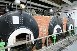 To the east of the dock is the brick pump house which has an arched roof, supported by timber beams, and a large brick chimney. The two centrifugal pumps for emptying the dock and steam boilers were imported from London. Three new Cornish boilers replaced the originals in 1907 and in 1924 the steam engines were replaced by electric motors constructed by Evans Deakin. During the busy war years the boiler house was enclosed by a concrete blockhouse. The Cornish boilers and their coal chutes, the pump, the electric engine with its sub-station and rope drives are extant but inoperative.[1]