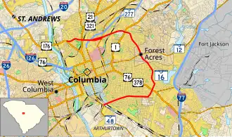 SC 16 begins at an intersection with SC 48, just south of the University of South Carolina. Going in a counterclockwise direction, it goes east to U.S. Routes 76 and 378 (US 76/US 378) at Devine Street, then north intersecting SC 12 (Forest Drive) within the small portion of Forest Acres through which SC 16 travels, and US 1 (Two Notch Road). Heading now west, it intersects SC 555 (Farrow Road) before splitting into one-way streets: northbound along Marshall Street and southbound along Sunset Drive and Academy Street. SC 16 recombines onto Sunset Drive at the SC 277 (Northeastern Freeway) northbound on-ramps, flanked by the Palmetto Health Richland. Continuing east, SC 16 ends at US 176 (River Drive), approximately one mile (1.6 km) east of the Broad River.