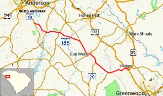 South Carolina Highway 185 (SC 185) is a 26.920-mile (43.324 km) state highway in the U.S. state of South Carolina. The highway connects Hodges and Due West with the Homeland Park area.