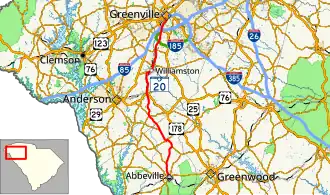 South Carolina Highway 20 (SC 20) is a primary state highway in the U.S. state of South Carolina. The highway connects the cities of Abbeville, Belton, Williamston and Greenville. The 53-mile-long (85 km) highway is signed as a west-east highway though it physically runs south-to-north.[4]