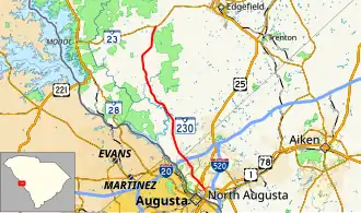 SC 230 begins at an intersection with SC 23 in the unincorporated community of West Store Crossroads, within Edgefield County. The western end of the highway travels through Sumter National Forest. It travels to the south-southwest and travels through Colliers, where it curves to the south. The highway gradually travels in more and more of a south-southeasterly direction. SC 230 crosses over Horn Creek. Just south of an intersection with Woodlawn Road and Briggs Road, the highway leaves the national forest and crosses over Anderson Branch. After curving back to the south, it crosses over Hardy Creek and Sweetwater Branch. The highway heads to the south-southeast again and travels through Poverty Hill. About 2,000 feet (610 m) later, it enters North Augusta, in which it is a major urban corridor. It crosses over Fox Creek and Pole Branch immediately before an interchange with Interstate 20 (I-20; Strom Thurmond Freeway). SC 230 has a short south section and passes underneath the North Augusta Greeneway. It then curves to the southeast before intersecting U.S. Route 25 Business (US 25 Bus.; Georgia Avenue). Here, SC 125 Truck begins a concurrency with SC 230. A few blocks later, they intersect US 25/SC 121 (Knox Avenue). Signage on the eastbound side notes that SC 230 ends here, but signage farther to the southeast shows that it continues concurrent with US 25/SC 121, which take on the Martintown Road name. The four highways intersect SC 125 (Atomic Road). Here, SC 230 meets its eastern terminus, and SC 125 Truck meets its southern terminus.[3]