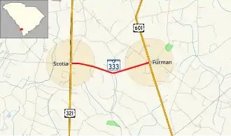South Carolina Highway 333 (SC 333) is a 3.340-mile (5.375 km) primary state highway in the U.S. state of South Carolina. It serves as a connector highway between the towns of Scotia and Furman.