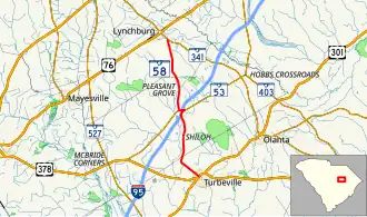 SC 58 begins at an intersection with SC 341 (Lynchburg Highway) just southeast of Lynchburg, within Lee County. It travels on a fairly southern direction, enters Sumter County, and has an intersection with SC 53. The highways travel concurrently to the east and have an interchange with Interstate 95 (I-95) on the northwestern edge of Shiloh. Approximately 500 feet (150 m) later, SC 53 splits off toward the northeast, while SC 58 enters Shiloh proper. Upon leaving the city limits of Shiloh, the highway enters Clarendon County. It curves to the southeast and enters Turbeville. There, it meets its eastern terminus, and intersection with U.S. Route 301 (US 301)/US 378 (Main Street). Here, the roadway continues as Gamble Street.[4]