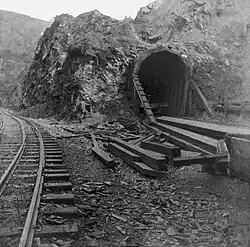 The construction of Tunnel #2/Summit started in 1877, with Chinese workers under O.B. Castle.[15]: 102 It would take nearly two years and 30 lives to complete, as it crosses the San Andreas Fault and workers encountered oil and natural gas seepage which would explode.[15]: 96 One series of explosions, early in the morning of November 18, 1879, claimed multiple lives.[25] It was destroyed by a 5 ft (1.5 m) lateral shift following the 1906 San Francisco earthquake and had to be dug again; with the broad-gauge conversion, the work was not completed until March 1909.[15]: 140–142