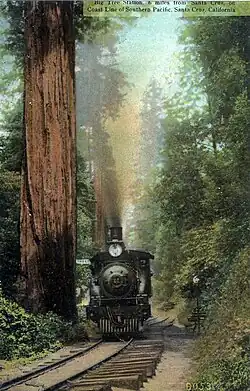 The South Pacific Coast Railroad (SPC) was a 3 ft (914 mm) narrow gauge steam railroad running between Santa Cruz, California, and Alameda, with a ferry connection in Alameda to San Francisco. The railroad was created as the Santa Clara Valley Railroad, founded by local strawberry growers as a way to get their crops to market in San Francisco and provide an alternative to the Southern Pacific Railroad. In 1876, James Graham Fair, a Comstock Lode silver baron, bought the line and extended it into the Santa Cruz Mountains to capture the significant lumber traffic coming out of the redwood forests. The narrow-gauge line was originally laid with 52-pound-per-yard (26 kg/m) rail on 8-foot (2.44 m) redwood ties;[1] and was later acquired by the Southern Pacific and converted to 4 ft 8+1⁄2 in (1,435 mm) standard gauge.[2]