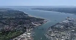 The river Itchen (lower centre) flowing into Southampton Water