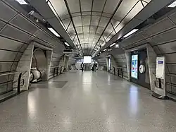 The two platforms have platform screen doors which are meant to prevent passengers or debris from falling onto the tracks. They are connected at each end to the lower concourse which is a simple tunnel between the platforms and is illuminated by glass and steel "beacons" at each end, and is faced with stainless steel panels, deliberately left unpolished.[19] Stairs lead up to a section of high floor in the central area of the tunnel, from where three narrow tube-like escalator shafts lead sideways (south) to the higher concourse.[11]