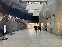 The upper concourse is the centrepiece of the station. It is a space 16 metres (52 ft) high with a glass roof that allows daylight to enter deep into the station.[18] It is faced with a spectacular glass wall, 40 metres (130 ft) long, consisting of 660 specially cut pieces of blue glass, which was designed by the artist Alexander Beleschenko.[16] MacCormac said the design of this and the lower concourse was inspired by a stage set design by 19th-century Prussian architect Karl Friedrich Schinkel for The Magic Flute.[16] The wall is one of the extension's more celebrated architectural features, winning critical approval and a number of awards.