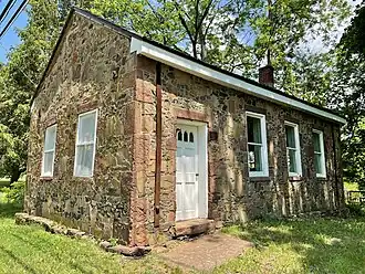The Southwest District School is located in a rural-residential area of southwestern Bloomfield, on the east side of Simsbury Road (Connecticut Route 185) a short way south of its junction with High Hill Road. It is set close to the road on a very small parcel of land. It is a single-story stone structure, with a gabled roof. The stone appears to be locally quarried rock, cut in random sizes and shapes, with square-cut corner blocks. Windows are set in rectangular openings, with sandstone sills and lintels. The street-facing gable facade has two windows, while the south-facing facade has the entrance at the left end, and three windows to its right. The door opens into a small vestibule, which has had a closet partitioned off the far end, with the balance of the building occupied by the classroom. The vestibule is finished in tongue-and-groove wood boards, while the main chamber is plastered, with wide moulding.[2]