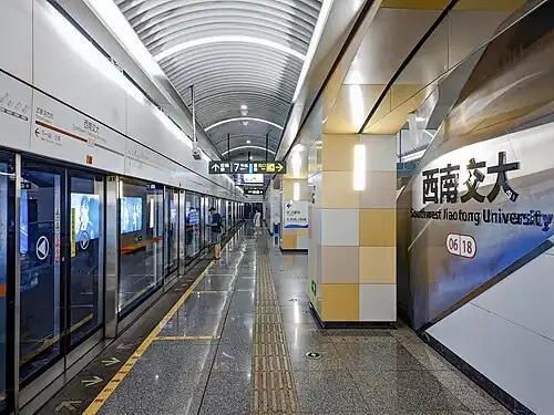 Southwest Jiaotong University (Chinese: 西南交大) is a station on Line 6 and Line 7 of the Chengdu Metro in China. It was opened on 6 December 2017.[1][2] The station serves the nearby Southwest Jiaotong University.