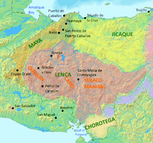 The Jicaque people also occupied lands in the region,[11] in an area along the Atlantic coast from the Ulúa River east to an area between the Leán and Cuero rivers, and extending to the Nombre de Dios mountains.[12] The Chorotega and the Pipil were both peoples belonging to the Mesoamerican cultural zone and fully partaking in it; the Pipil were found along the northern limits of Honduras,[11] while the Chorotega occupied territory in the south, around the Gulf of Fonseca.[13] Lenca and Nahuas inhabited the islands of the Gulf of Fonseca.[14] Early colonial documents suggest that the important settlements of Naco and Quimistan, in the northwest, were multiethnic, inhabited by Pipil and Lenca or Maya, or all three.[15] Naco in particular was a large town and an important centre for commerce that became an early focus for Spanish expeditions.[16] Those groups in the northeast of Honduras were relatively isolated culturally, and not fully integrated into the exchange networks of either Mesoamerica or the Intermediate Area.[10] The western fringe of Honduras was occupied by Maya peoples, the Ch'ol and the Ch'orti'. The Ch'ol occupied the region around the Amatique Bay and along the lower Chamelecón River. The Ch'orti' inhabited the upper reaches of the Chamelecón River and the Sensenti Valley.[12]