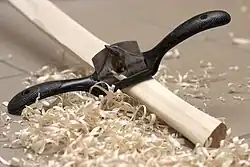 A spokeshave is a hand tool used to shape and smooth woods in woodworking jobs such as making cart wheel spokes, chair legs,[1] paddles, bows, and arrows.[2] The tool consists of a blade fixed into the body of the tool, which has a handle for each hand. Historically, a spokeshave was made with a wooden body and metal cutting blade. With industrialization metal bodies displaced wood in mass-produced tools. Being a small tool, a spokeshave is not suited to working large surfaces.
