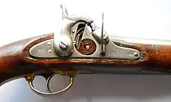 The Model 1855 rifled musket was modified in 1858 to include a simpler rear sight (the typical flip-up leaf type), a patch box on the side of the buttstock, and an iron nosecap to replace the brass one. This variant is sometimes referred to as the Type II with the earlier model designated the Type I.[9]