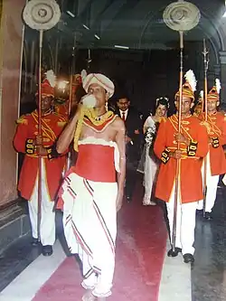 Sri Lankan military bands (Sinhala: ශ්රී ලංකා යුද හමුදා කණ්ඩායම) refer to the joint-service musical units of the Sri Lanka Armed Forces representing the Sri Lanka Army, the Sri Lanka Navy, and the Sri Lanka Air Force. The three bands mentioned, which were established in 1949, 1952 and 1970 respectively and are the seniormost in the armed forces. They are composed of many ceremonial marching bands as well as concert bands which are base for the band's success. The band participates in main social and cultural events, including formal state visits and military parades. All army regiments also contain a regimental band for ceremonial duties.[1][2]