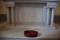 The front of the church features four pillars and a round window above the main doorway. In the center is a Latin inscription: "DOM S NATHANAELIS BARTHOLOMAEI APOSTOLI" (which means The apostle Nathanael Bartholomew). The altar stands on a raised platform, and in front, two pairs of small-sized columns have Corinthian capitals, and a bas-relief depicting the meeting of Nathanael and Philip the Apostle. Nearby is a small cemetery.