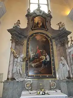 The first side altar is the Altar of the Holy Family on the epistle side of the chancel, opposite the pulpit. It was built after the Great Tabán Fire around 1815 in a similar Late Baroque style to the main altar and all the other important items of church furniture. The pediment is decorated with two flaming vases, the Eye of Providence and two putti holding a cross. This is the altar where the eucharist has been kept in a Neo-rococo tabernacle since the predella of the main altar was removed. Four candlesticks and two statues of angels in adoration are displayed on the ledge. The altarpiece is set in a concave frame decorated with gilded rosettes. The original painting was destroyed in the bombardment of 1849. The present altarpiece was painted by Jakab Marastoni in 1850 in a similar Italianate style as the painting on the main altar. It depicts a sacra conversazione between the Holy Family and John the Baptist, Elizabeth and Zechariah with angels and putti in the sky.
