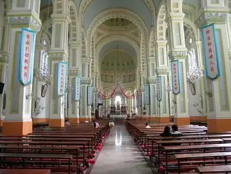 The interior of Xikai is based on French and Roman architecture styles.[9] The long main hall is lined by 14 large columns (two rows of seven), leading to a gallery-style tee.[10] The nave has a stacked composite side portico, supported by semi-circular tops.[11] The tall central dome consists of an octagonal drum roof that complements the octagonal windows throughout the church.[12] Its side windows are stained glass with inlay painting. Painted, ornate murals, full of Biblical scenes, cover the walls.[13]