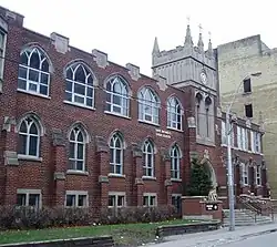 St. Michael's Choir School is located next to St. Michael's Cathedral Basilica and operates out of four buildings at 56, 66, 67 and 69 Bond Street. In 2016, the school's secondary school building, located at 69 Bond Street, was rated as in need of "critical" repairs and had the worst-performing score among Toronto Catholic District School Board secondary schools on the Ontario Ministry of Education's Facility Condition Index.[102] In 2018, the Ministry of Education announced it would spend $11.2 million CAD[103][104][105] to construct a new consolidated school building at 67 Bond Street designed by KPMB Architects.[106][107][108] In 2022, KPMB Architects, the Archdiocese of Toronto, and the Toronto Catholic District School Board submitted a new development plan to the City of Toronto for a revised six-storey school design that incorporates and restores the historic Gothic revival-style façade at 66 Bond Street.[109][110]
