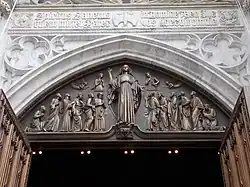 After the spires were finished, the trustees of St. Patrick's Cathedral decided that bells should be installed in one tower. No arrangements had yet been made for the bells because parts of the project, such as interior design, remained incomplete.[107] The cathedral tested a set of four bells in the north tower in July and August 1889 to determine the tower's acoustic properties.[108][109] The altar of the Holy Family was consecrated at the cathedral in 1893.[110] A set of bells for the cathedral was manufactured in the United States. After the archbishop consecrated them, the bells were found to be defective and were never hung in the belfry. In 1895, the cathedral ordered a second set of bells to be made by the Paccards in France.[111] The new bells were blessed by Archbishop Michael Corrigan on August 15, 1897, though they had not been installed yet.[112][113] The framework for the bells was installed in the north tower the next month.[114] At the time of completion, St. Patrick's had more bells than any other church in the city, with 19; by comparison, Trinity Church had ten bells and Grace Church had nine.[115] Also in 1897, the Spiritual Sons of De La Salle funded a new altar for the cathedral.[116]