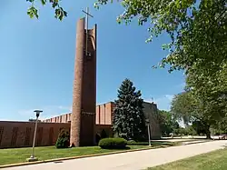 The parish outgrew its sandstone and wood building and updating the facility on a small plot of land was deemed impractical, so property was purchased outside of the downtown area. The present church building was completed in 1959 and it was consecrated in 1963. On May 7, 1962, St. Paul's was named the cathedral church of the Diocese of Quincy.[3] An addition to accommodate diocesan offices was completed in 1968.