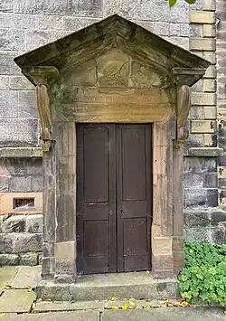 A small stone porch towards the east end of the south wall leads to the Fleetwood family burial vault. The doorway is inscribed with "Insignia Rici Fleetwood an hujus eccliae patronis, Anno Dni 1699".[1]C There are two more doorways on the south side of the nave, both have been restored and have Tuscan columns, triglyphs and pediments. Above the doorways are oval windows, added in the 19th century which, according to Clare Hartwell, "add a touch of sophistication".[17] There are large round-headed pairs of arched windows with Y-tracery, (possibly added later) and plain architraves.[17][26] There are three such windows on the north side and four on the south side with more round-headed windows in the apse.[26]