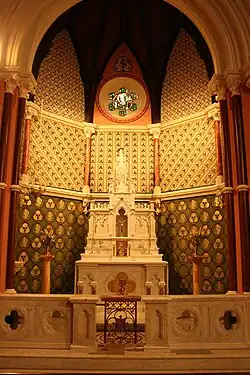 St Mary's contains four side chapels in addition to the main altar. The sanctuary is flanked by a pair of chapels, dedicated to the Sacred Heart (south) and the Blessed Virgin Mary (north). Flanking these large chapels are two smaller chapels, which front the transepts, dedicated to Saints of Ireland (south) and Saint Joseph (north). All four chapels and the sanctuary, terminate in semi-octagonal forms.