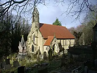 The chapel is in the Early English style and was designed by the architects Messrs Hadfield and Son with Mr. M.J. Dowling used as the contractor. It is built of dressed Greenmoor wallstone with Worrall stone dressing, internally it is 22 feet wide and 72 feet long, the roof is covered by Staffordshire tiles. At the chapel's western end is a sixty foot high bell turret in which hangs a five cwt bell by Mears of London. The chapel was designated a Grade II listed building in December 1984.[2] The cemetery's most notable grave is the Walsh monument, which is a Grade II listed structure. This is a vault and memorial constructed for the Walsh family, it consist of mostly granite and marble with decorative cast-iron railings and a 1.5-metre-high (4.9 ft) figure on top.[3]