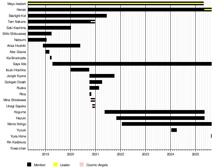 On October 25, 2020, following Tam Nakano's pairing with a debuting Mina Shirakawa into the 2020 edition of the Goddesses of Stardom Tag League, Mayu Iwatani officially announced Shirakawa as a full member of Stars. Nakano would name their tag team as "Cosmic Angels".[18] On November 14, 2020, Unagi Sayaka from Tokyo Joshi Pro Wrestling debuted in Stardom and joined the sub-unit of Cosmic Angels.[19] At Road to Osaka Dream Cinderella - Day 2 on December 16, 2020, Nakano, Shirakawa and Sayaka teamed up to defeat Oedo Tai's Bea Priestley, Natsuko Tora and Saki Kashima to win the Artist of Stardom Championship.[20] On December 20, 2020, at Osaka Dream Cinderella, Nakano announced that she, Shirakawa and Sayaka were splitting from Stars to act as a separate stable.[21]