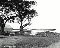 An artificial harbour was constructed in the 1880s,[19] with one breakwater running for 100 yards In a north-easterly direction and another to the south-east for 50 yards—from Cowrie Island—providing an entrance only 100 feet wide, with a depth of six feet of water.[16] The breakwater was extended westward around 1899,[20] to block completely the gap between Cowrie Island and the mainland.