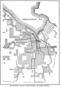 By around 1912 the city boasted 125 miles of streetcar trackage[1] (much of it electrified) and almost 30 streetcar lines as well as an electric interurban rail connection to Seattle. Tacoma also had a simple cable car loop running from South 11th and 'A' St. to what is known now as Martin Luther King Jr. Way, down South 13th St. back to 11th and 'A'. This simple and frequent line helped to integrate trolley lines that served each street elevation. It also helped to ferry passengers up Tacoma's steep hills which assisted in integrating the eastern and western sections of Downtown Tacoma.