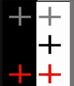 In the top row, a grey cross looks apparently darker on a light than on a dark surround. This well-known lateral brightness induction is probably caused by neural lateral inhibition. But in the second row, a cross that flickers at 8 Hz between black and white looks almost black on a light surround and almost white on a dark surround - stronger apparent contrast? And in the bottom row, both yellowish and the cross on the light surround looks reddish. Clearly, the achromatic surrounds are not inducing any colors—nothing is being induced. Instead, the visual system selects the phase that has the higher contrast and hence the greater salience.