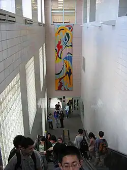 A wall in the school decorated with a mural named "Mnemonics." The mural was created in 1992 by Kristin Jones and Andrew Ginzel.During construction, the Battery Park City Authority, the Percent for Art Program of the City of New York, the Department of Cultural Affairs, and the New York City Board of Education commissioned Mnemonics, an artwork by public artists Kristin Jones and Andrew Ginzel. Four hundred hollow glass blocks were dispersed randomly from the basement to the tenth floor of the new Stuyvesant High School building. Each block contains relics providing evidence of geographical, historical, natural, cultural, and social worlds, from antiquity to the present time.[54] The blocks are set into the hallway walls and scattered throughout the building. Each block is inscribed with a brief description of its contents or context. The items displayed include pieces of the 15th Street Stuyvesant building, fragments of monuments from around the world, memorabilia from each of the 88 years' history of the old building, a Revolutionary War button, water from the Nile and Ganges Rivers, fragments of the Mayan pyramids, and various chemical compounds. Empty blocks were also installed to be filled with items chosen by each of the graduating classes up through 2080.[54] The S.H.S. installation later received the Award for Excellence in Design from the Art Commission of the City of New York.[55]