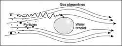 - a) Inertial impaction - When water droplets placed in the path of a dust-laden gas stream, the stream separates and flows around them. Due to inertia, the larger dust particles will continue on in a straight path, hit the droplets, and become encapsulated.