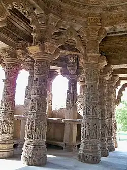 Sabhamandapa or Rangamandapa, the assembly hall or dancing hall is parallelogram in plan with rows of pillars opening entrance on each side diagonally. The extensively carved exterior has a series of recessed corners giving an impression of the star-like plan of it.[1] There are 52 intricately carved pillars. Madhusudan Dhaky has suggested that the sabhamandapa may have been later addition based on style and construction.[15]