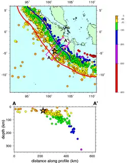 Variation of seismicity with depth across the Sunda Trench subduction zone, low-angle part is the Sunda megathrust – 2007 Bengkulu earthquakes mainshock shown by star