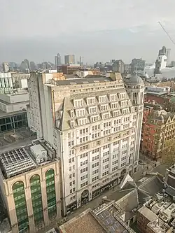 Sunlight House is a 14-storey steel and concrete structure, clad in Portland stone. The building is almost square in plan, with three street frontages, and a large central light-well. There is a basement swimming pool below a leadlight domed skylight at first floor in the centre of the lightwell.[2] Each of the three street façades are seven bays, with the two street corners expressed as three sided towers, which each rise to a four level octagonal turret, topped by a domed lantern and finial.[3] Behind and between the turrets, the top four floors are expressed as a mansard roof with multiple setback square dormer windows, which together with the turrets create a distinctive skyline and a major feature in the city.