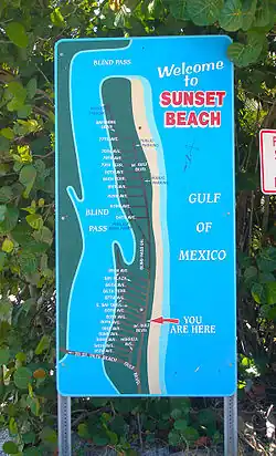 One of three main Treasure Island beaches, along with Sunshine and Mid-Island, it is primarily a residential beach neighborhood. Mid-century fisherman cottages mix with lush Key West-style homes, between the Gulf of Mexico and Boca Ciega Bay.[1] From the southern end of Sunset Beach, one can look directly across Blind Pass at Upham Beach in St. Pete Beach.