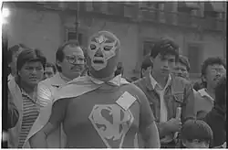 Superbarrio Gómez is a Mexican "real-life superhero", satirist and organizer.[1] Inspired by the Luchador wrestler El Santo, and his social-justice superhero persona in comics and movies, Superbarrio wears red tights and a red and yellow wrestler's mask. Rather than fight crime and corruption with violence, he uses his image to organize labor rallies and protests, and file petitions. Although he has been claimed to be Marco Rascón Córdova,[2] the authorized biography Todos Somos Superbarrio states that although Rascón Córdova, a long-time social activist, did create the character, Marco was never Superbarrio, but it was rather a lesser-known political organizer, who was in turn substituted for a wrestler in the few times he actually fought on the ring.[3]