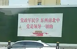 A sign on a Chinese street that reads "Party, government, military, civilian, and academic, north, south, east, west, and center, the Party leads everything."