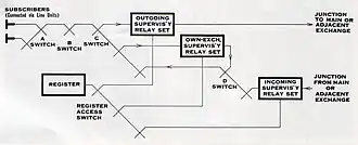In TXE2s, a call which terminated within the same exchange went through seven switching stages, whereas a call going out to another exchange went through just three switching stages. The switches were designated as A, B, C and D (the paths were A-B-C for outgoing, A-B-C-D-C-B-A for internal and D-C-B-A for incoming). The common control equipment consisted of B- and C-switch selectors, supervisory selectors (a supervisory relay set stayed in-circuit throughout each call), Register Selectors, Registers and Call Control.