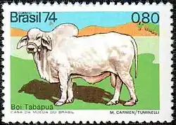 The Tabapuã breed was the first humped cattle developed in Brazil as the result of undetermined crossings between Nellore, Guzerat cattle and a little Gir cattle, in the 1940s in Água Milagrosa farm, located in Tabapuã city, São Paulo State, Brazil. The "polled cattle factor" originates from the "Mocho National" cattle breed, the descendants of European cattle.[1] The breed is of great economic importance in meat production in Brazil and it is also relevant cattle for its impressive ability to adapt to different environmental conditions. Tabapuã cattle are distributed throughout Brazil and are exported to Argentina, Uruguay, Venezuela and other countries.[2]