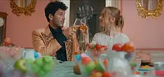 A screenshot from the music video, which shows Yatra and a girl guests eating in a dining room.