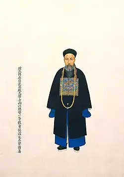 Taqibu was born in one of the three camps outside the Beijing Banner Firearms Brigade, served as a retainer in his early years, and was later promoted to the third class guards.[5] In the early years of Xianfeng, Taqibu was selected to be sent out to the Green Standard in Hunan, serving as a military authority, and also as a guard of the Zuoying. Soon after, he was promoted to the rank of guerrilla for the defense of Changsha, and served as a general of the Chinese army.[5] At that time, Zeng Guofan was recruiting rural soldiers in his hometown in Hunan, and deployed his officers and soldiers for training every month. Taqibu accompanied him on every parade. Zeng Guofan discussed military affairs with him, and was surprised by his talent. He tested the troops under his command and found them to be particularly capable and neat.[5] He was angered by Qingde's jealousy, who instigated Bao Qibao, the governor, to humiliate Taqibu. Zeng Guofan wrote a letter to dismiss Qingde and recommended Taqibu, saying that his "loyalty and bravery can be put to great use, and if he fails to fight well in the future, he will be willing to share the blame".[5] Therefore, Taqibu was promoted to the rank of vice general, and also led the training army. The governor Zhang Liangji also recommended Taqibu as a vice-general.[5]