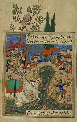 ![]() Bahram Gur killing a white elephant, from a folio of a manuscript of the Tarikh-e negarestan, created in 1569 in Safavid Iran | |